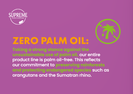 Supreme Petfoods proudly offers a product line that is completely palm oil-free. This decision reflects our commitment to protecting endangered species like orangutans and preserving rainforests. By eliminating palm oil from our products, we actively contribute to the fight against deforestation and climate change, promoting a more sustainable future.